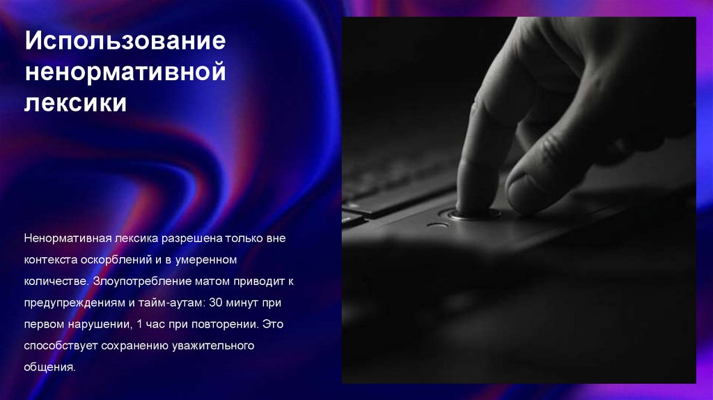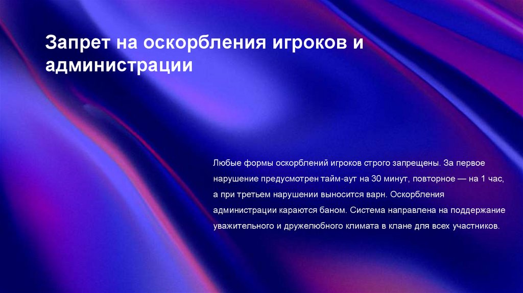 влечёт предупреждение с тайм-аутом на 30 минут, повторное — таймаут на 1 час. Такая политика помогает поддерживать удобство и