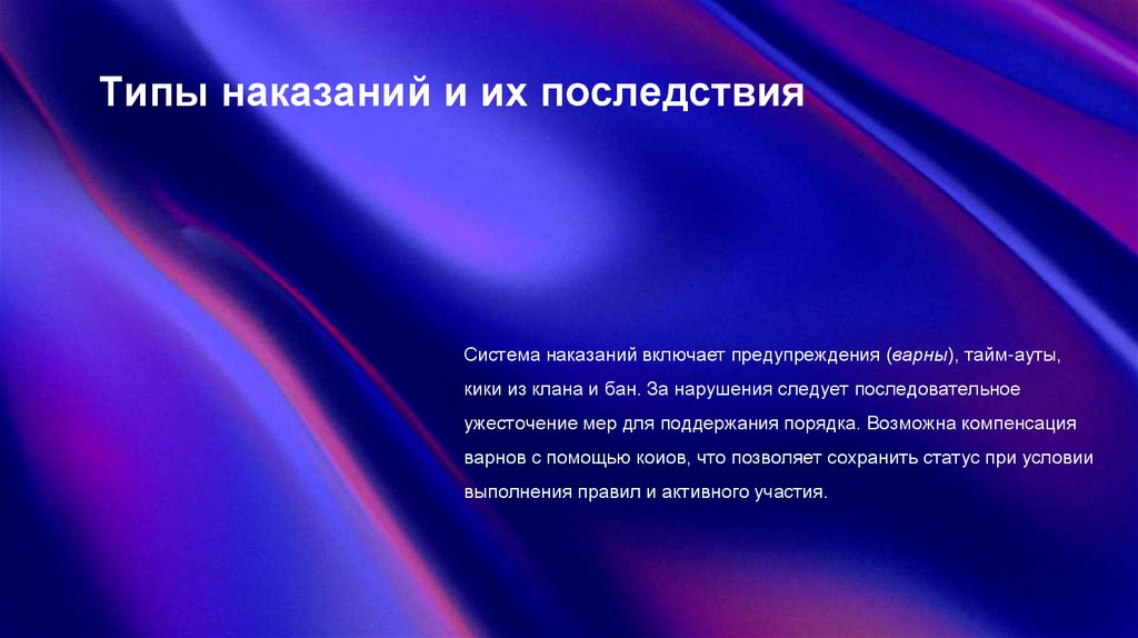 Типы наказаний и их последствияСистема наказаний включает предупреждения (варны), тайм-ауты,
