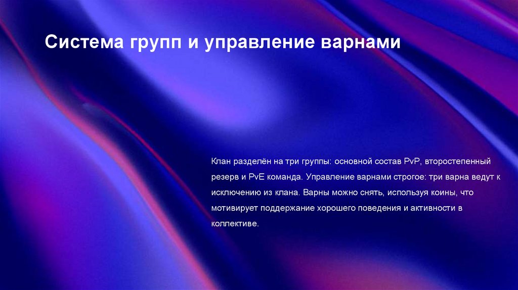 Система групп и управление варнамиКлан разделён на три группы: основной состав PvP, второстепенный