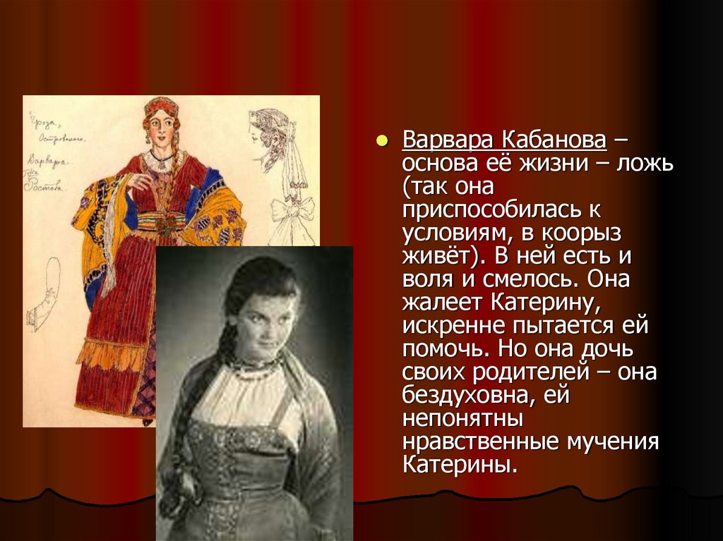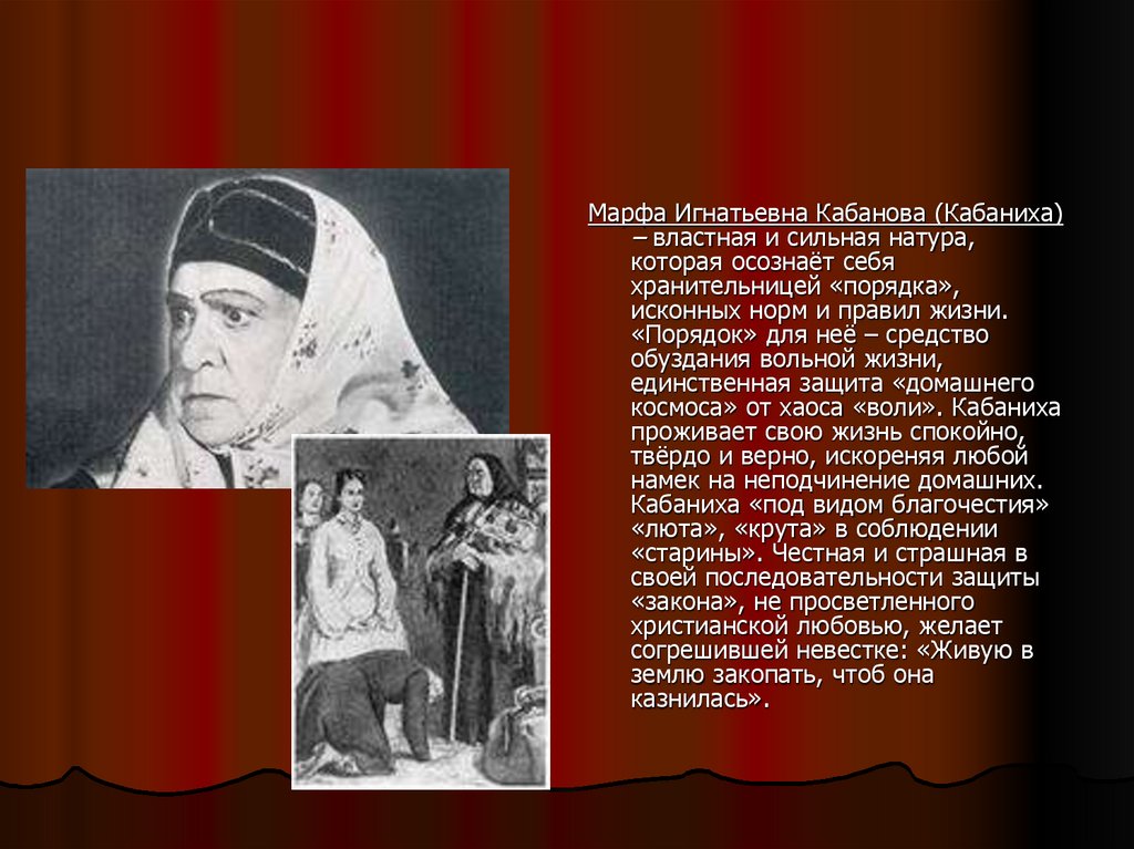 Марфа Игнатьевна Кабанова (Кабаниха)– властная и сильная натура,