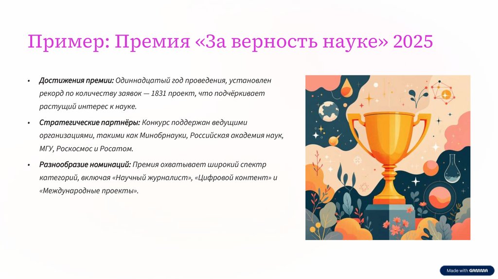 Пример: Премия «За верность науке» 2025Достижения премии: Одиннадцатый год проведения, установлен