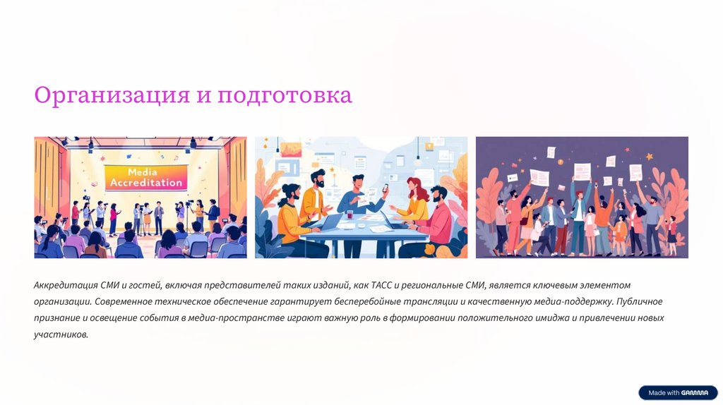 Организация и подготовкаАккредитация СМИ и гостей, включая представителей таких изданий, как ТАСС и региональные СМИ, является ключевым элементом