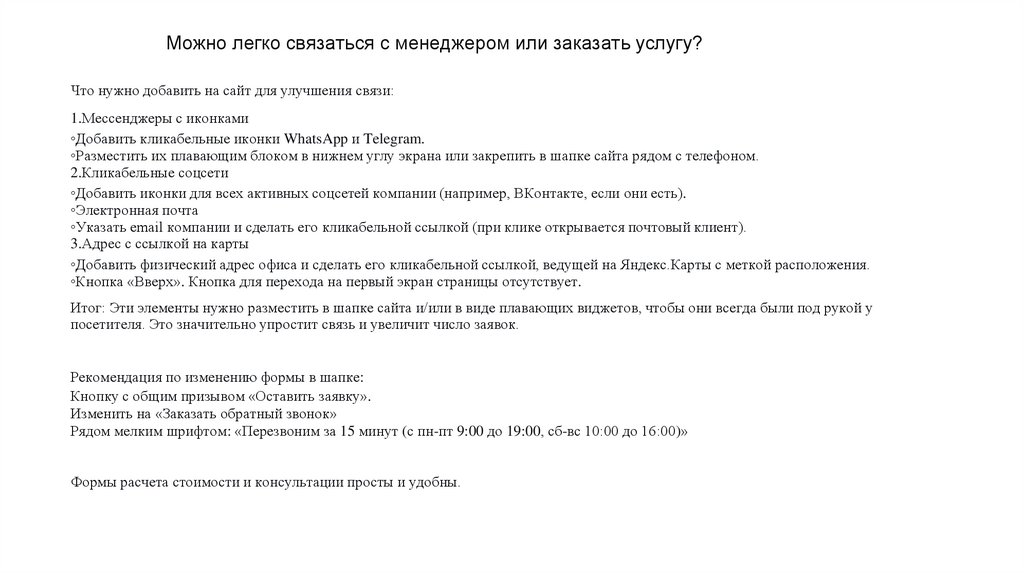 Можно легко связаться с менеджером или заказать услугу?Что нужно добавить на сайт для улучшения связи: