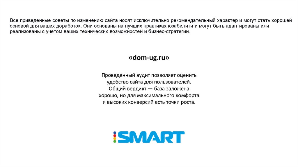 Все приведенные советы по изменению сайта носят исключительно рекомендательный характер и могут стать хорошейосновой для ваших доработок. Они основаны на лучших практиках юзабилити и могут быть адаптированы или