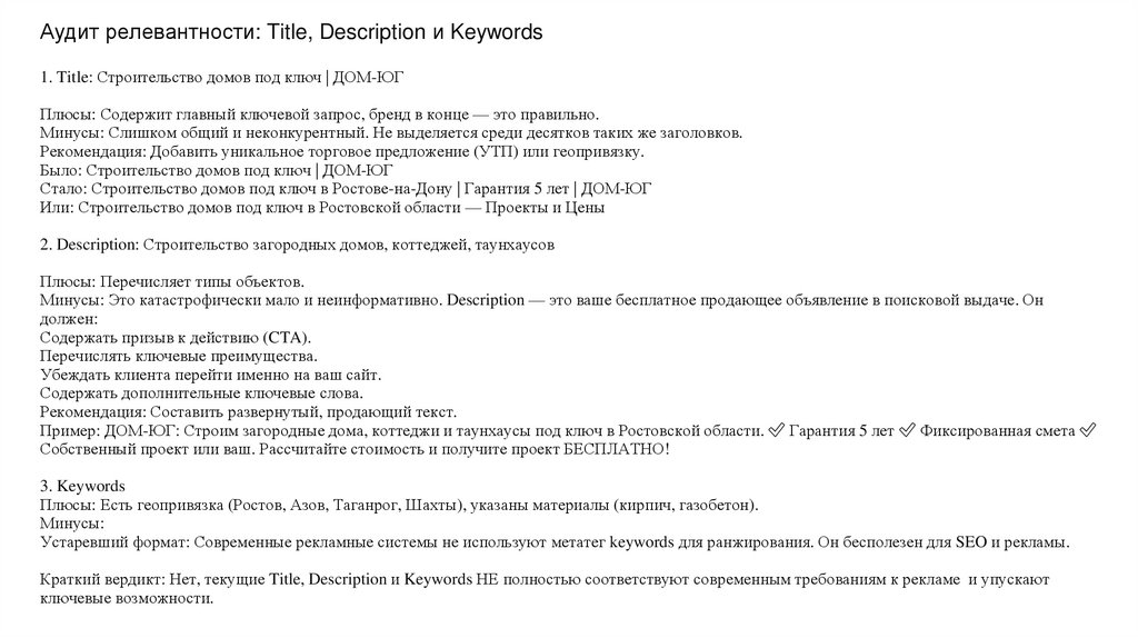 Аудит релевантности: Title, Description и Keywords1. Title: Строительство домов под ключ | ДОМ-ЮГ