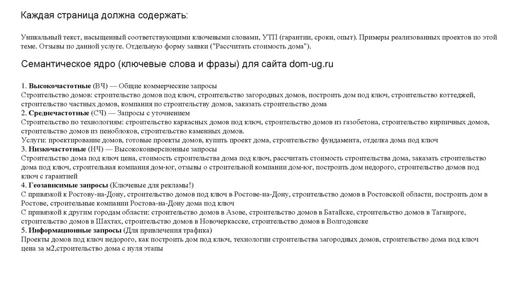 Каждая страница должна содержать:Уникальный текст, насыщенный соответствующими ключевыми словами, УТП (гарантии, сроки, опыт). Примеры реализованных проектов по этой