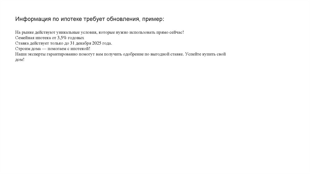 Информация по ипотеке требует обновления, пример:На рынке действуют уникальные условия, которые нужно использовать прямо сейчас!