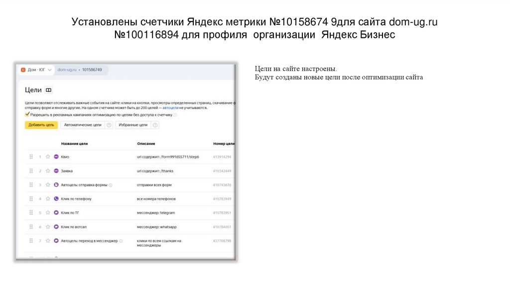 Установлены счетчики Яндекс метрики №10158674 9для сайта dom-ug.ru№100116894 для профиля организации Яндекс Бизнес
