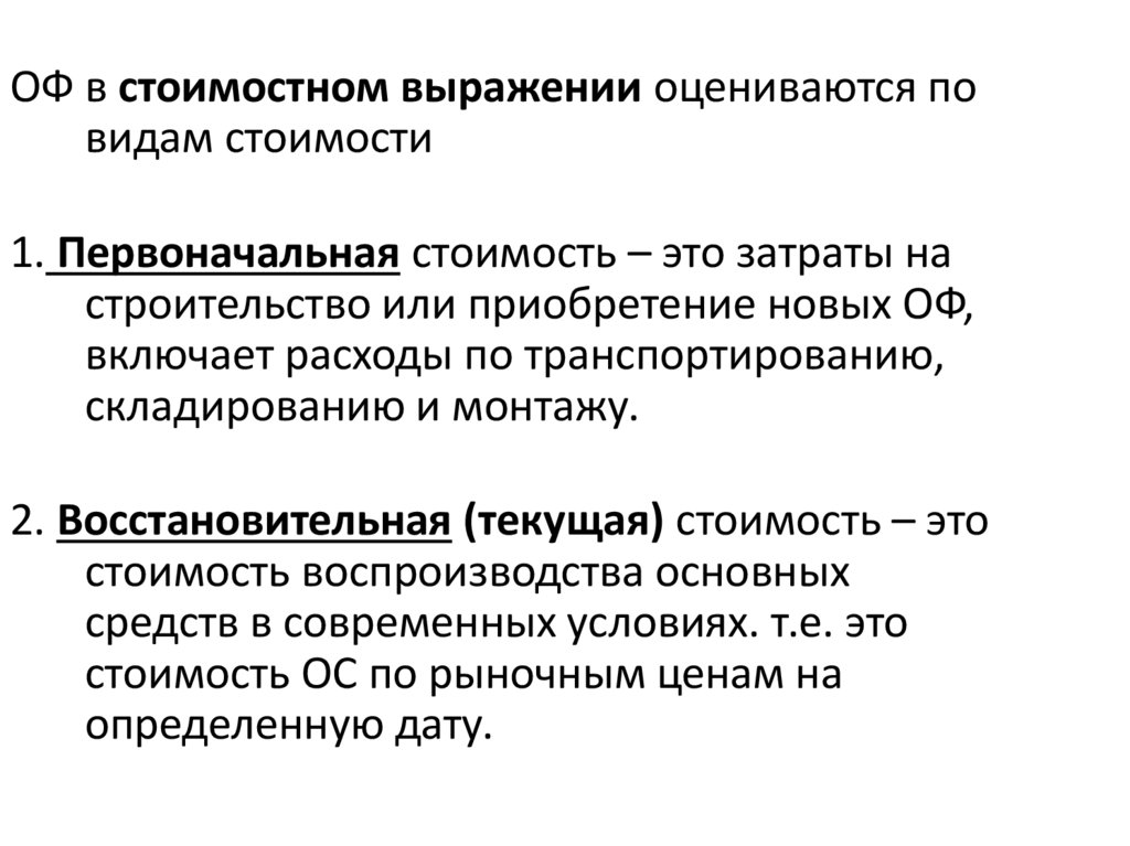ОФ в стоимостном выражении оцениваются повидам стоимости