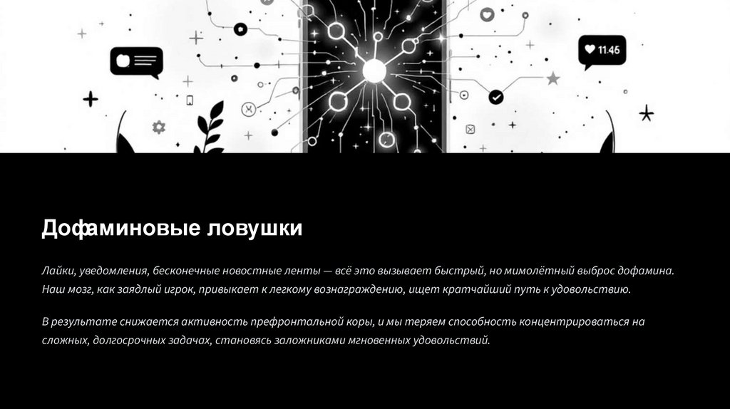 Дофаминовые ловушкиЛайки, уведомления, бесконечные новостные ленты — всё это вызывает быстрый, но мимолётный выброс дофамина.