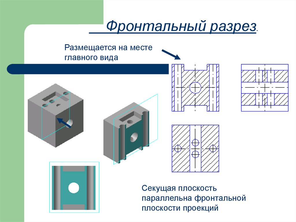 В разрезах показывается то, чтополучается в секущей плоскости и