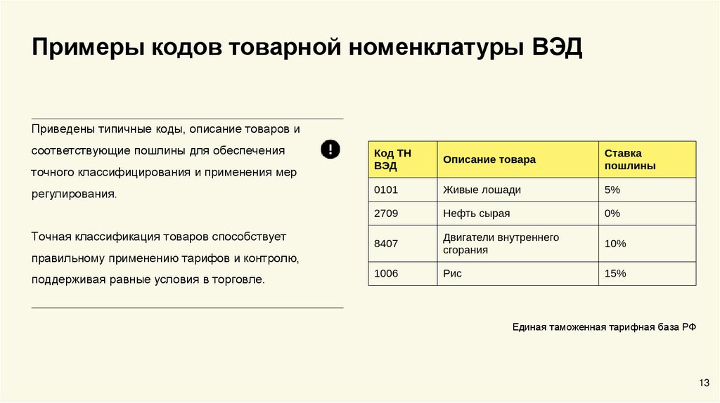 Примеры кодов товарной номенклатуры ВЭДПриведены типичные коды, описание товаров и