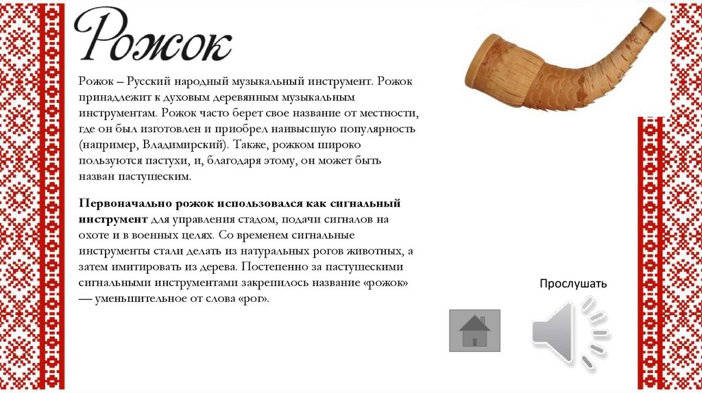 Рожок – Русский народный музыкальный инструмент. Рожокпринадлежит к духовым деревянным музыкальным