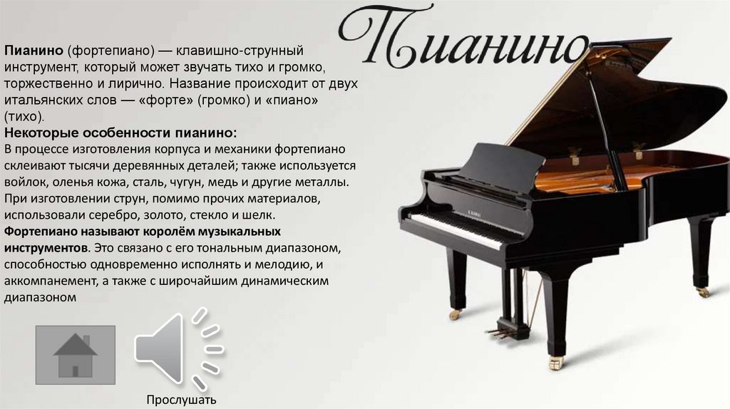 Пианино (фортепиано) — клавишно-струнныйинструмент, который может звучать тихо и громко,