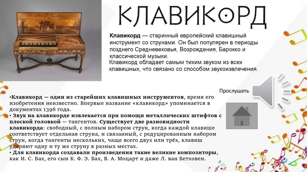 •Клавикорд — один из старейших клавишных инструментов, время его