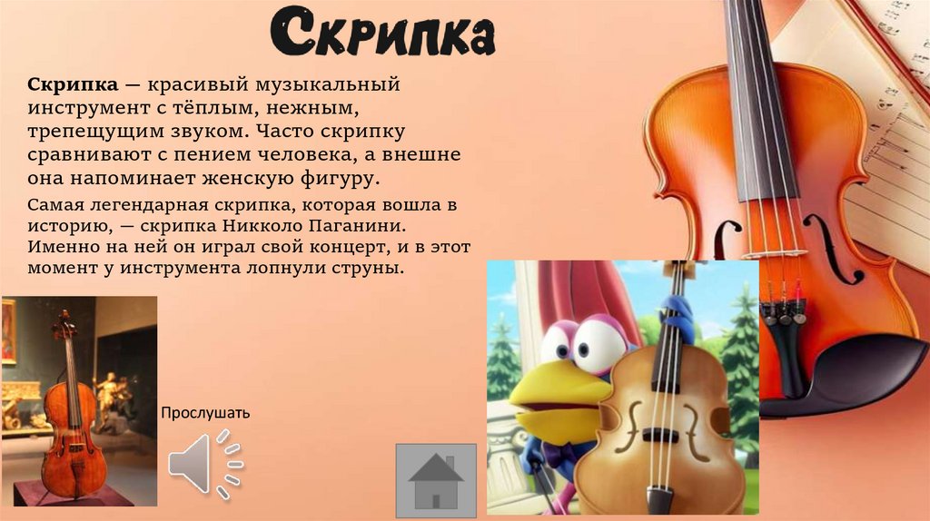 Скрипка — красивый музыкальныйинструмент с тёплым, нежным,