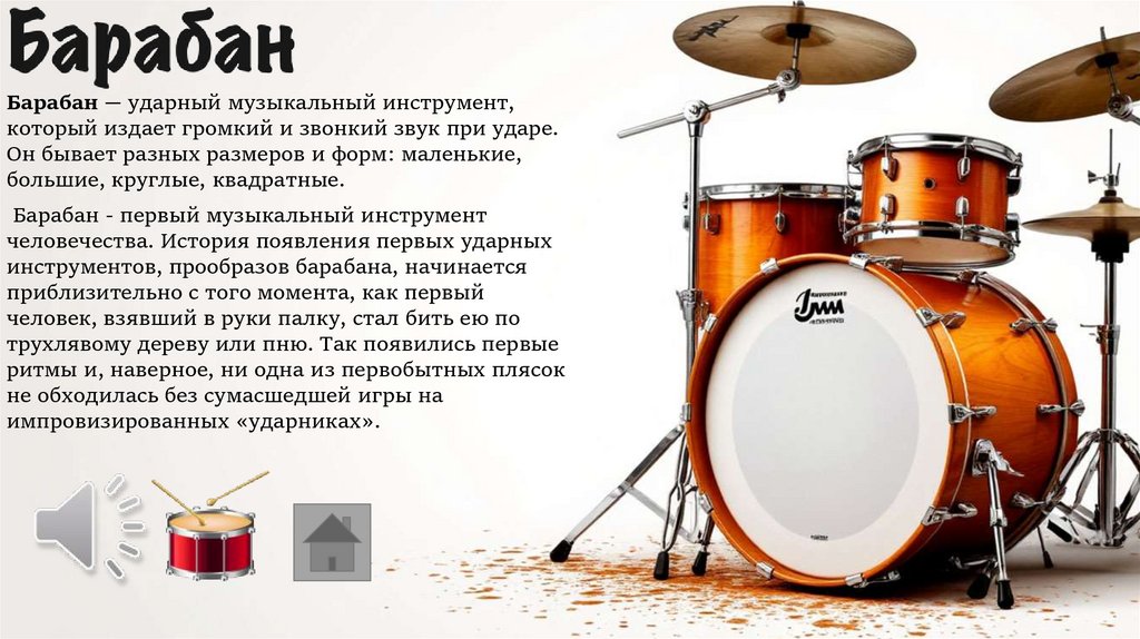 Барабан — ударный музыкальный инструмент,который издает громкий и звонкий звук при ударе.