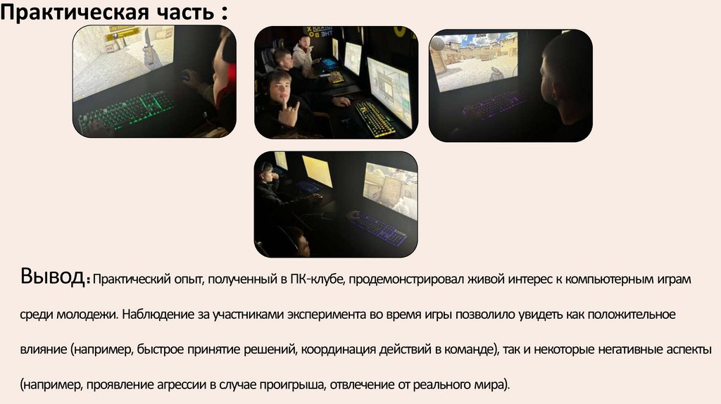 Практическая часть :Вывод : Практический опыт, полученный в ПК-клубе, продемонстрировал живой интерес к компьютерным играм