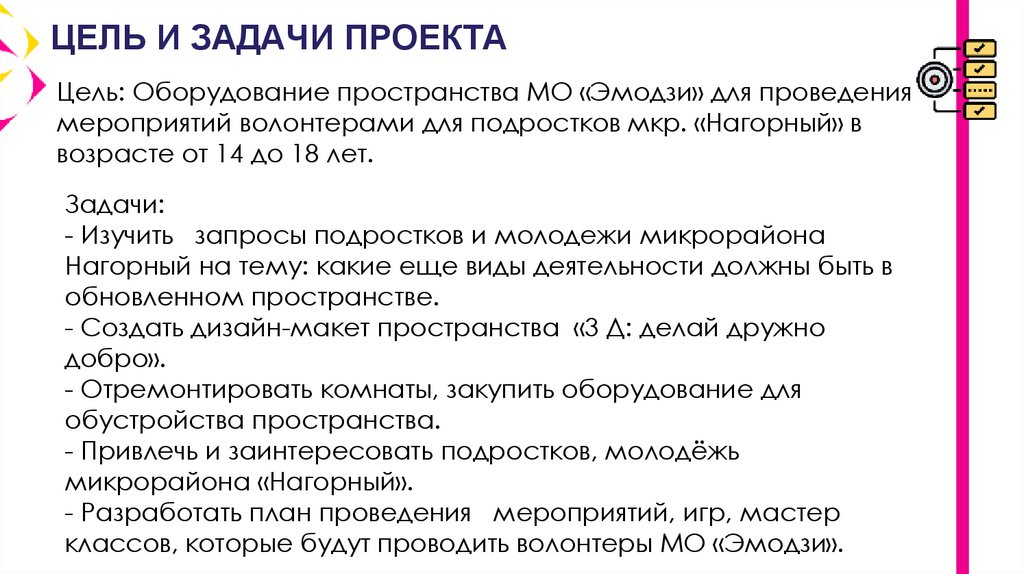 ЦЕЛЬ И ЗАДАЧИ ПРОЕКТАЦель: Оборудование пространства МО «Эмодзи» для проведения