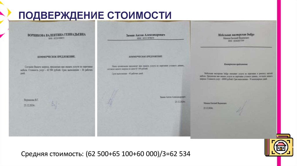 ПОДВЕРЖДЕНИЕ СТОИМОСТИСредняя стоимость: (62 500+65 100+60 000)/3=62 534