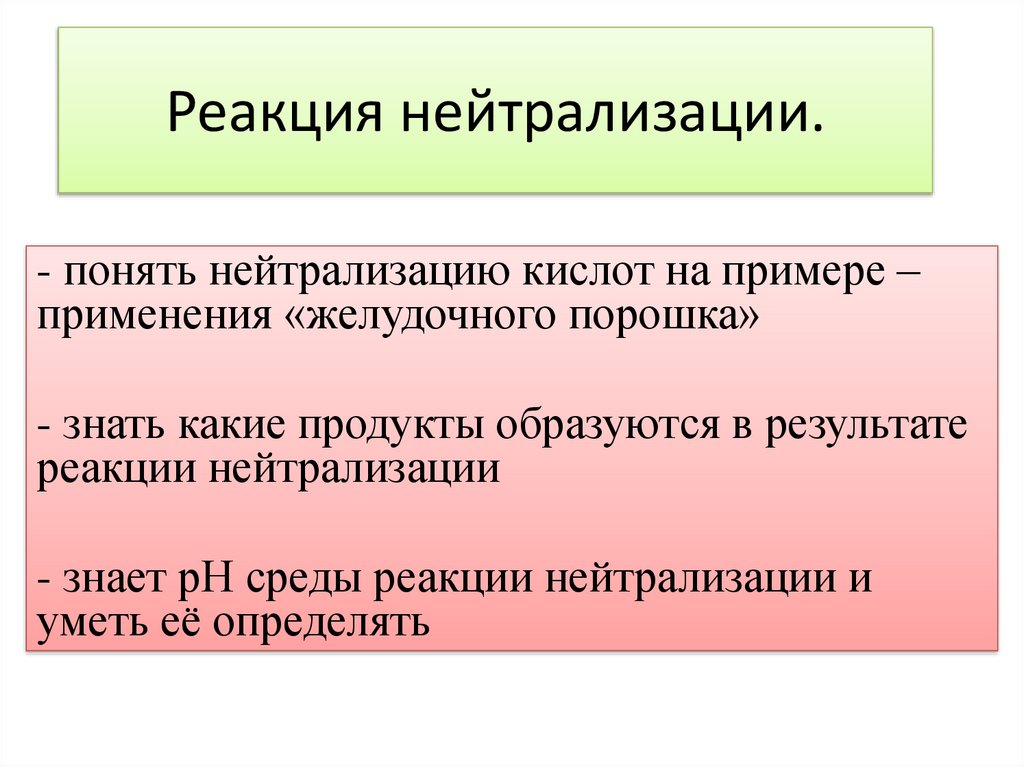 - понять нейтрализацию кислот на примере –применения «желудочного порошка»