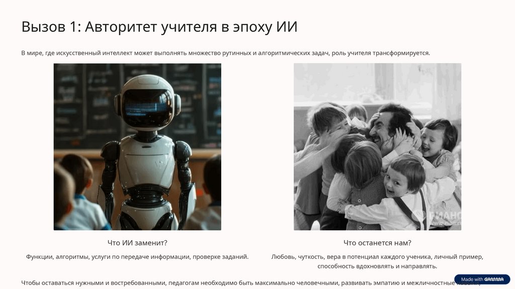 Вызов 1: Авторитет учителя в эпоху ИИВ мире, где искусственный интеллект может выполнять множество рутинных и алгоритмических задач, роль учителя трансформируется.
