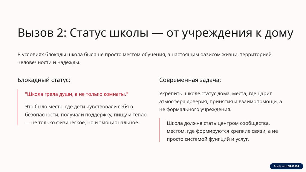 Вызов 2: Статус школы — от учреждения к домуВ условиях блокады школа была не просто местом обучения, а настоящим оазисом жизни, территорией