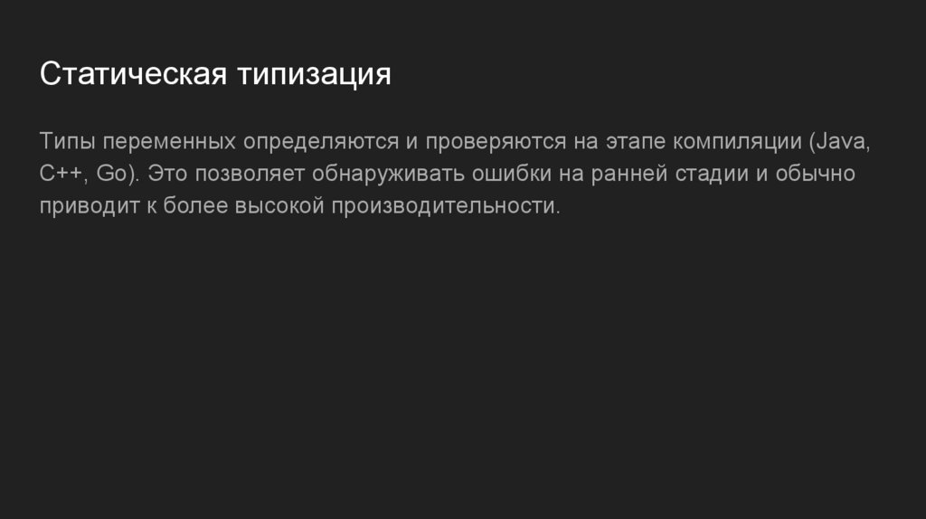 Статическая типизацияТипы переменных определяются и проверяются на этапе компиляции (Java,