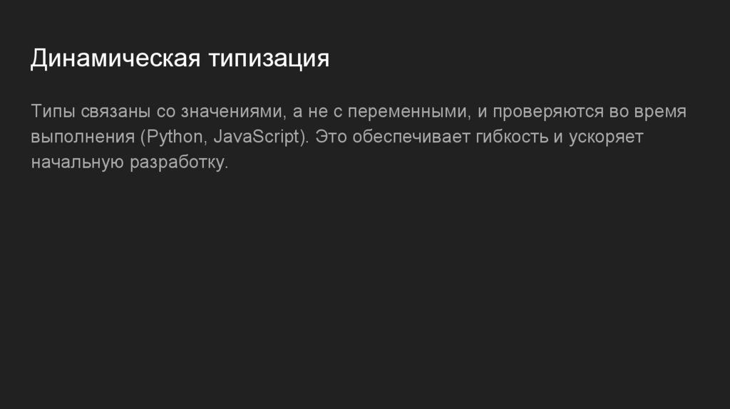 Динамическая типизацияТипы связаны со значениями, а не с переменными, и проверяются во время