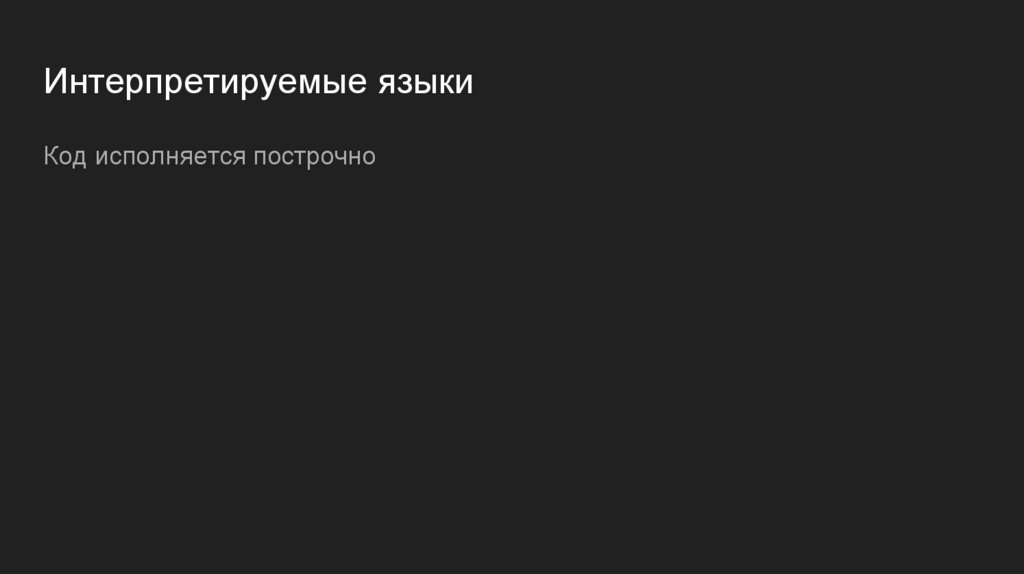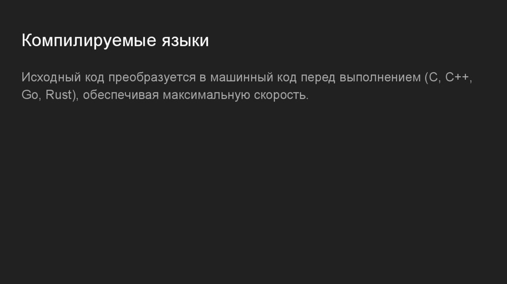 Компилируемые языкиИсходный код преобразуется в машинный код перед выполнением (C, C++,