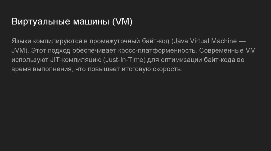 Виртуальные машины (VM)Языки компилируются в промежуточный байт-код (Java Virtual Machine —