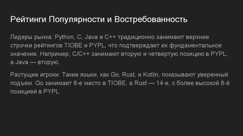 Рейтинги Популярности и ВостребованностьЛидеры рынка: Python, C, Java и C++ традиционно занимают верхние