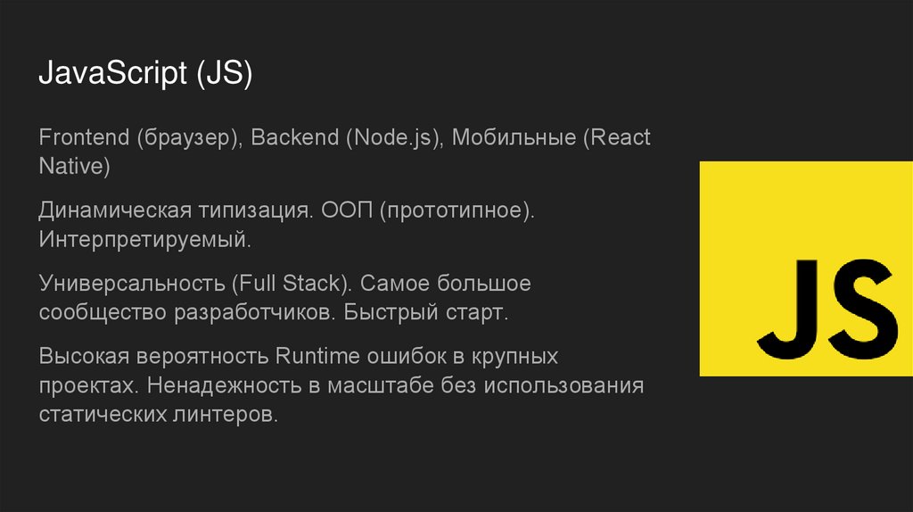 JavaScript (JS)Frontend (браузер), Backend (Node.js), Мобильные (React