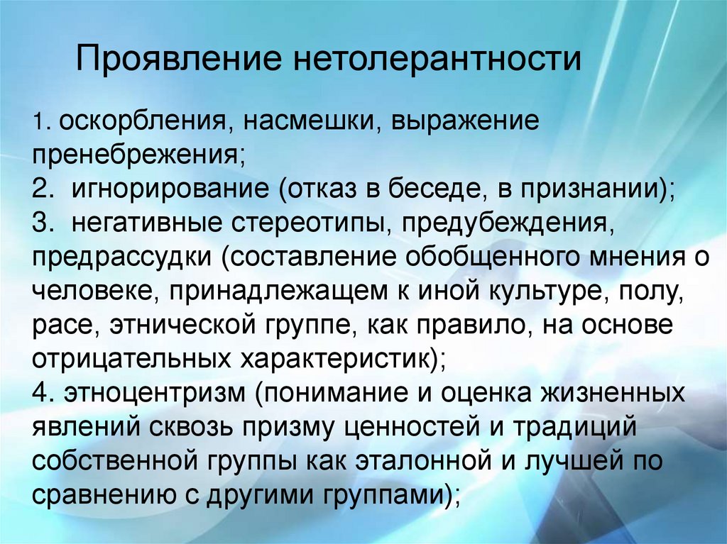 Проявление нетолерантности1. оскорбления, насмешки, выражение