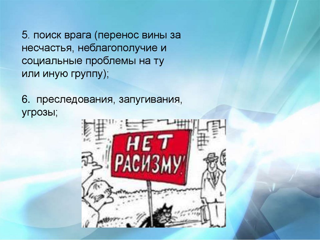 5. поиск врага (перенос вины занесчастья, неблагополучие и