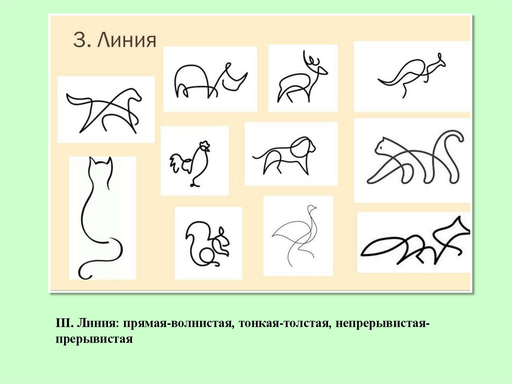 III. Линия: прямая-волнистая, тонкая-толстая, непрерывистаяпрерывистая17.