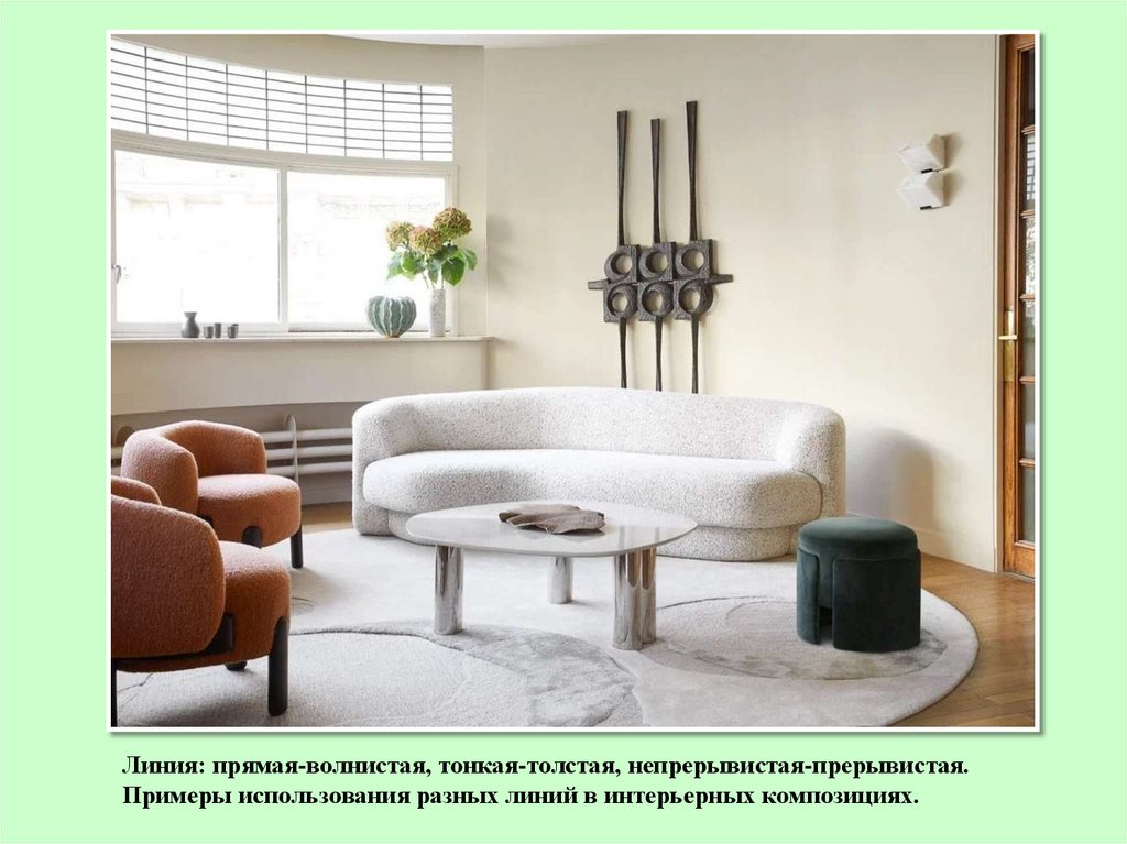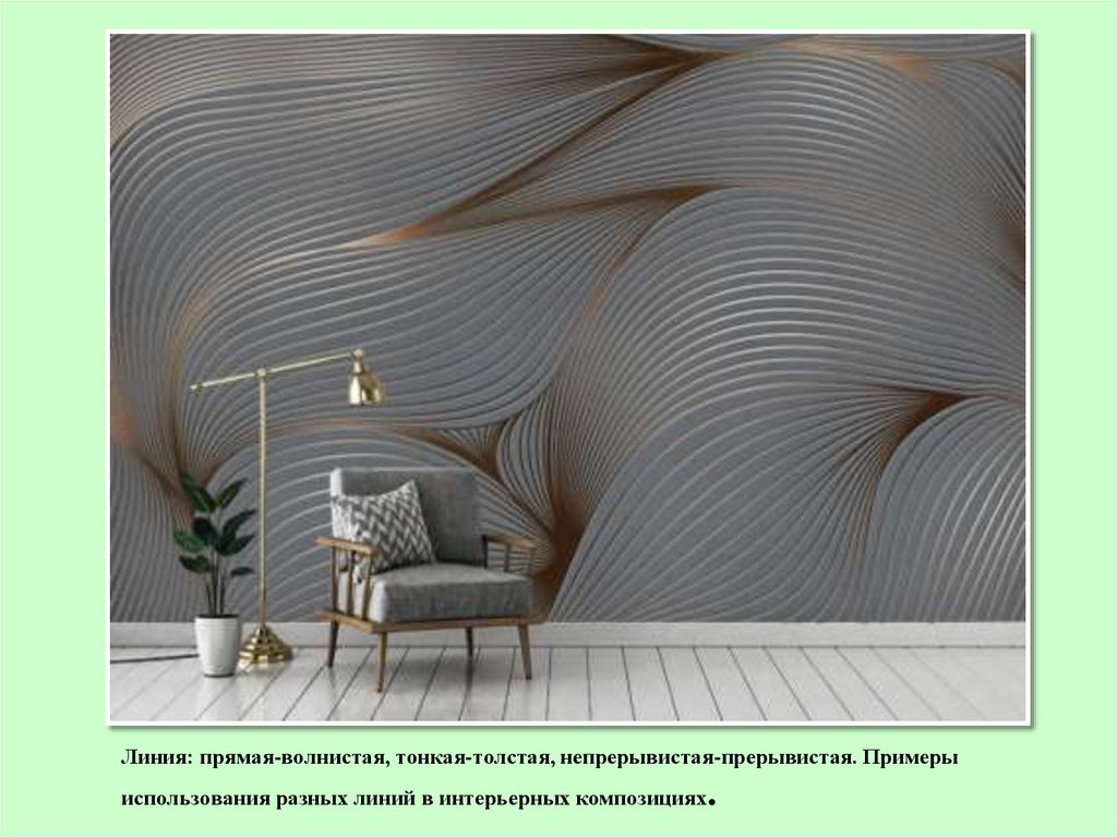 Линия: прямая-волнистая, тонкая-толстая, непрерывистая-прерывистая.Примеры использования разных линий в интерьерных композициях.