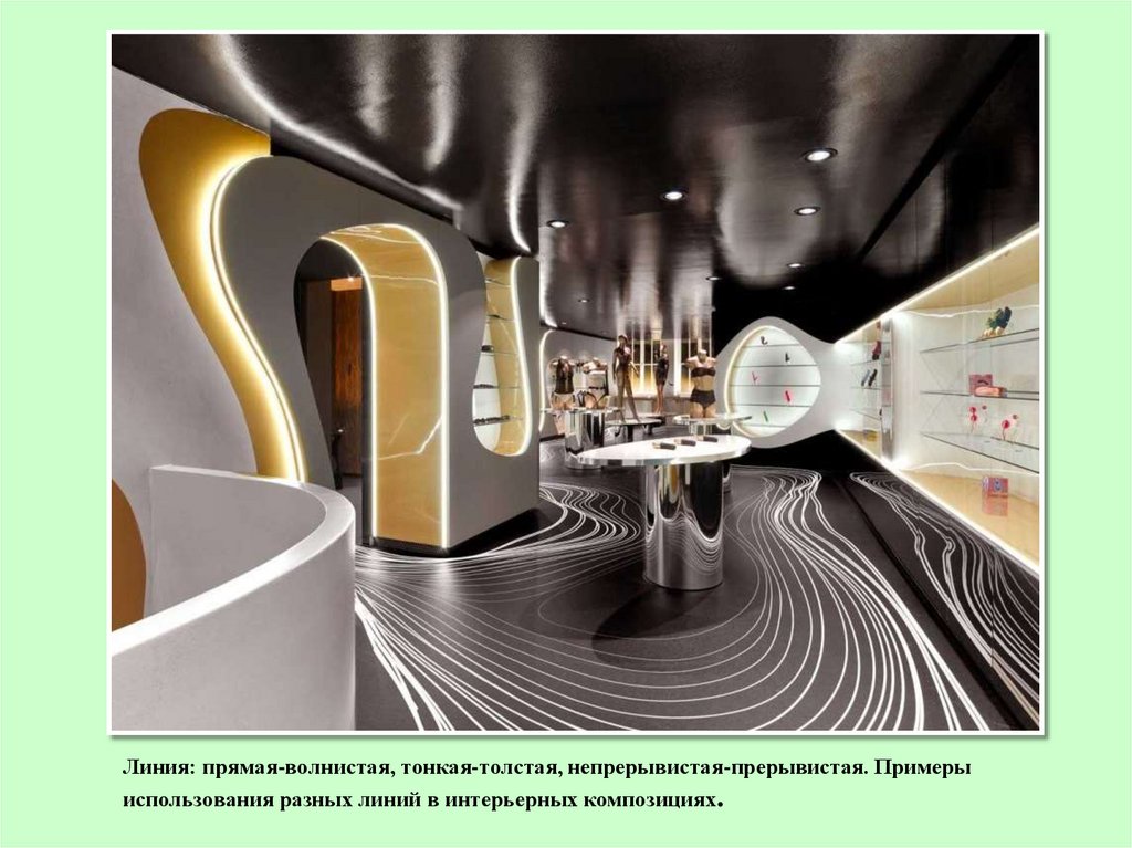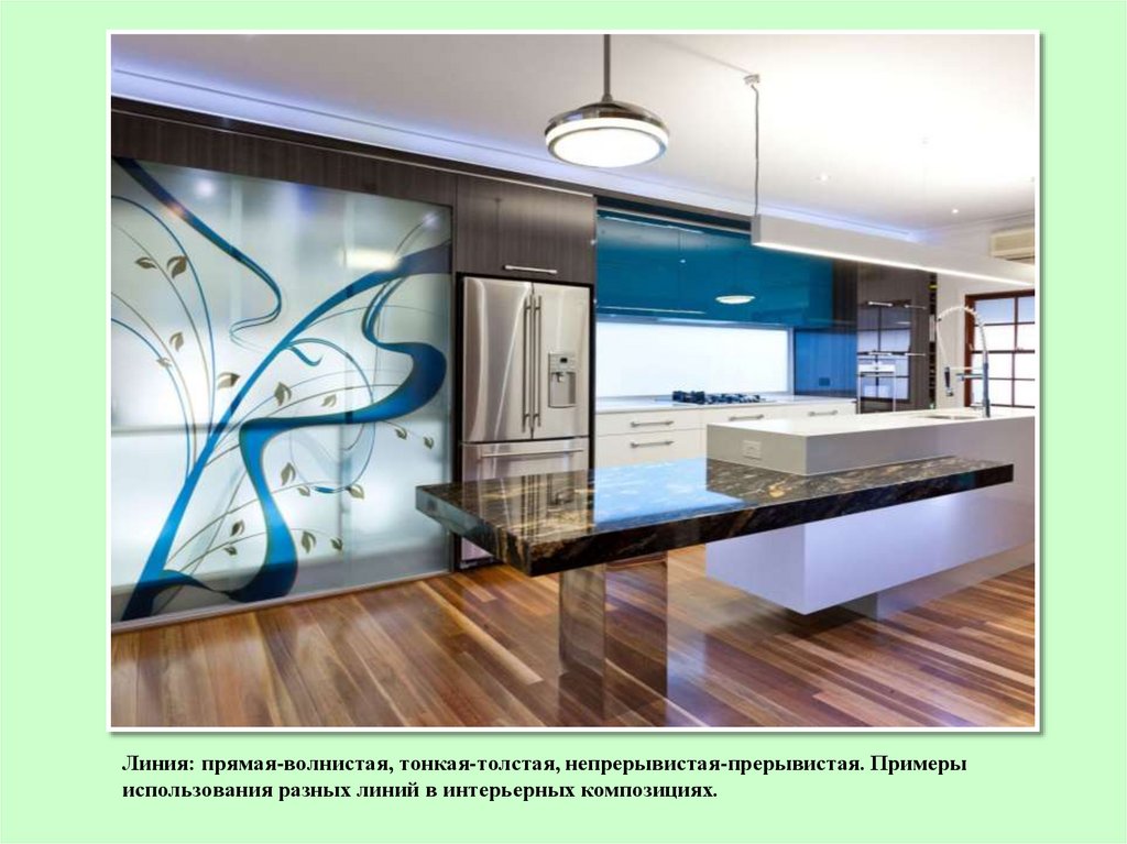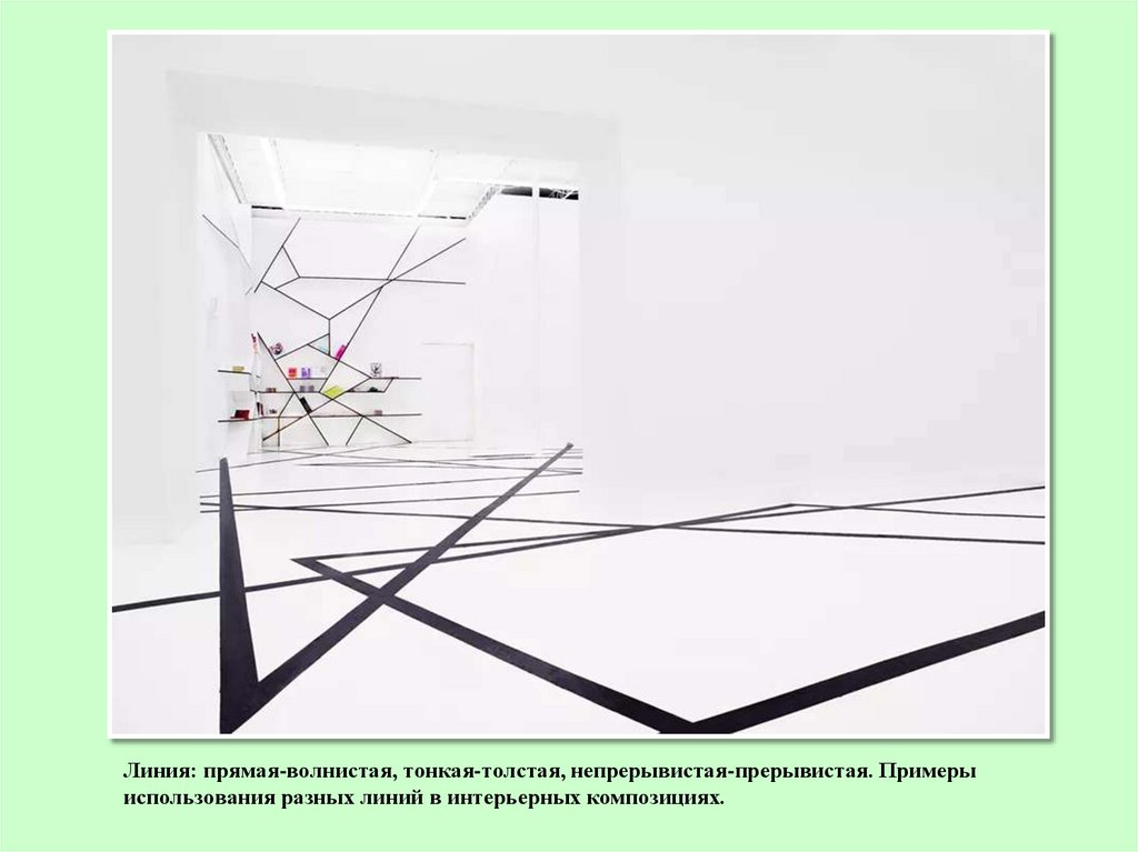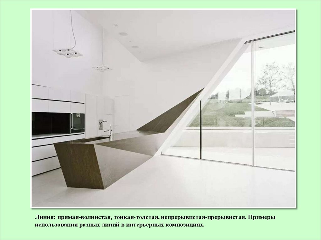 Линия: прямая-волнистая, тонкая-толстая, непрерывистая-прерывистая. Примерыиспользования разных линий в интерьерных композициях