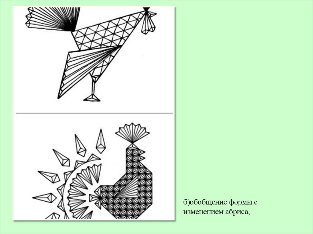 б)обобщение формы сизменением абриса,