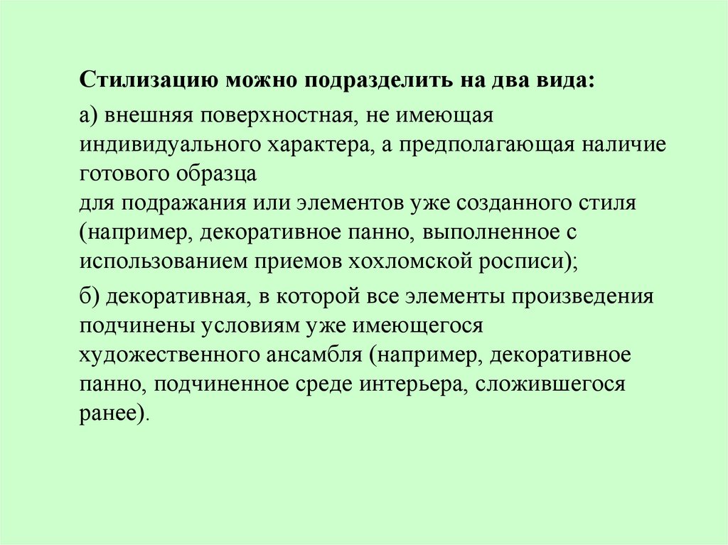 Стилизацию можно подразделить на два вида:а) внешняя поверхностная, не имеющая