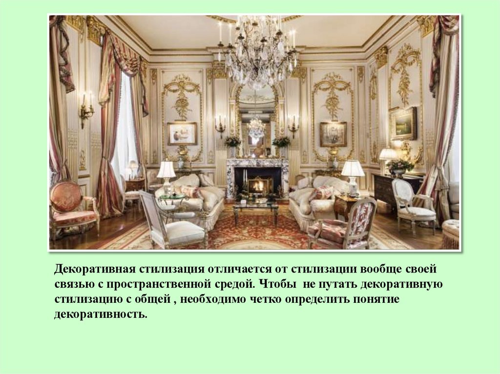 Декоративная стилизация отличается от стилизации вообще своейсвязью с пространственной средой. Чтобы не путать декоративную