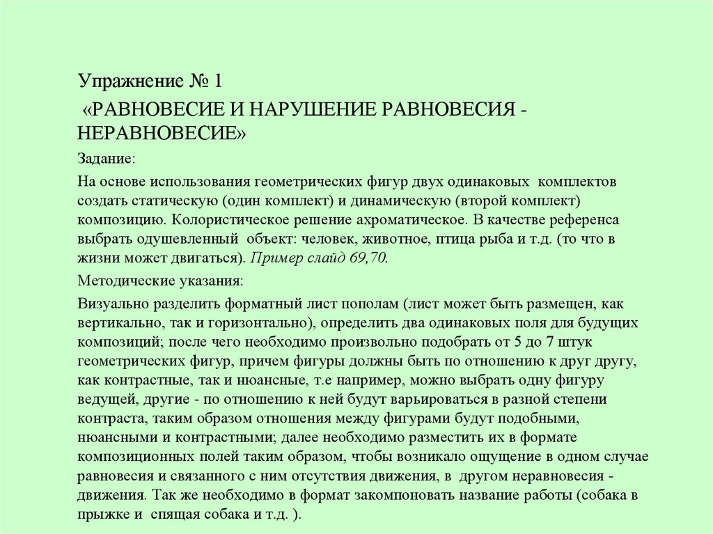 равновесия и связанного с ним отсутствия движения, в другом неравновесия движения. Так же необходимо в формат закомпоновать название работы (собака в