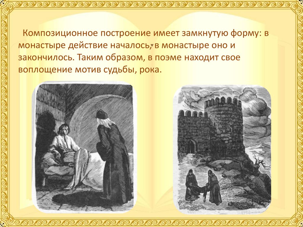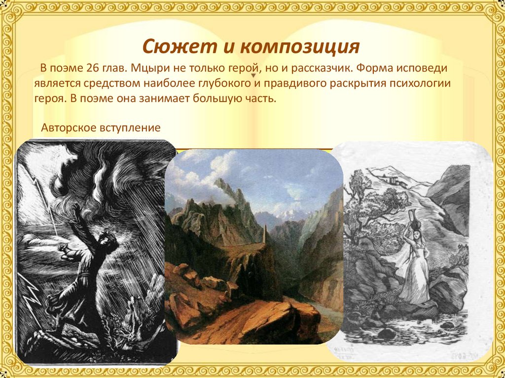 Сюжет и композицияВ поэме 26 глав. Мцыри не только герой, но и рассказчик. Форма исповеди