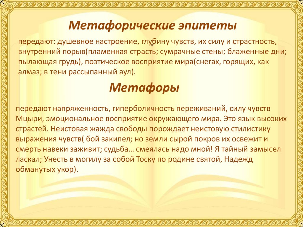 Метафорические эпитетыпередают: душевное настроение, глубину чувств, их силу и страстность,