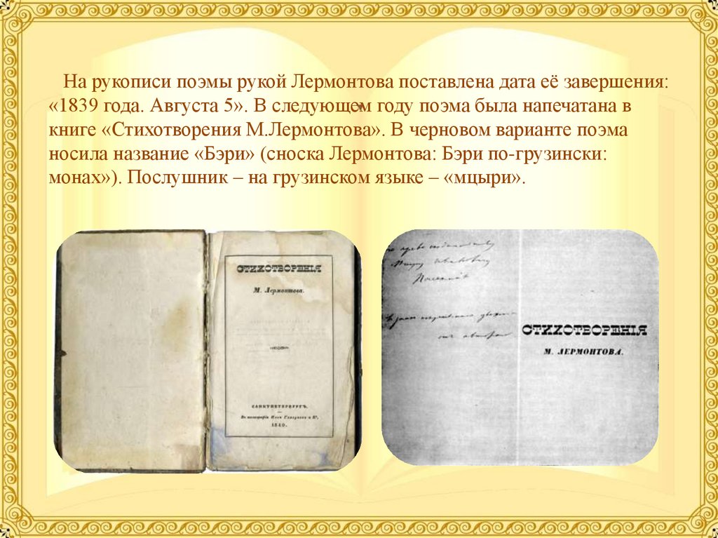 книге «Стихотворения М.Лермонтова». В черновом варианте поэма