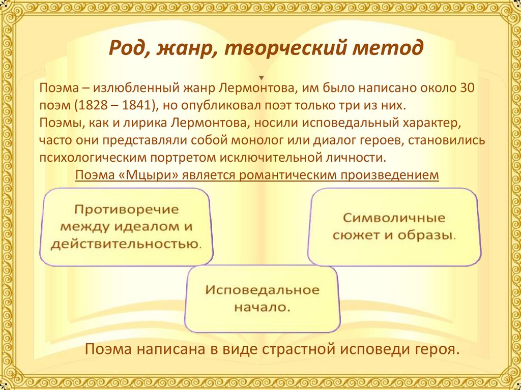 Род, жанр, творческий методПоэма – излюбленный жанр Лермонтова, им было написано около 30