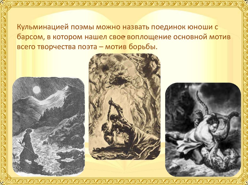 Кульминацией поэмы можно назвать поединок юноши сбарсом, в котором нашел свое воплощение основной мотив