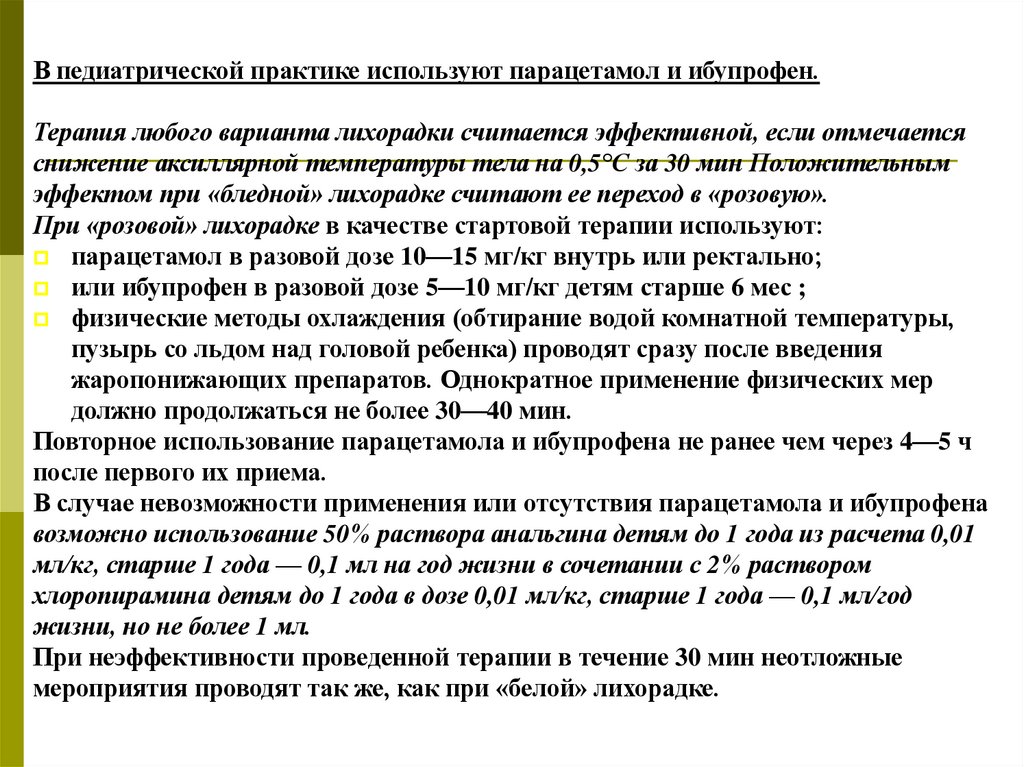В педиатрической практике используют парацетамол и ибупрофен.Терапия любого варианта лихорадки считается эффективной, если отмечается