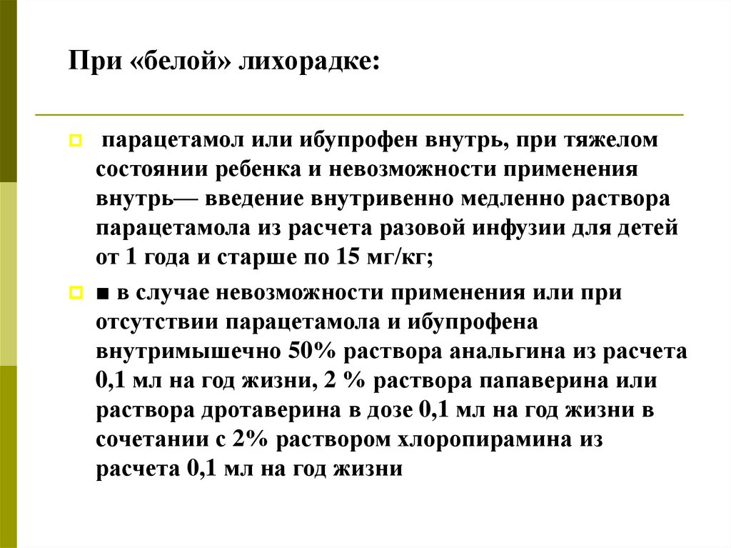 парацетамол в разовой дозе 10—15 мг/кг внутрь или ректально;