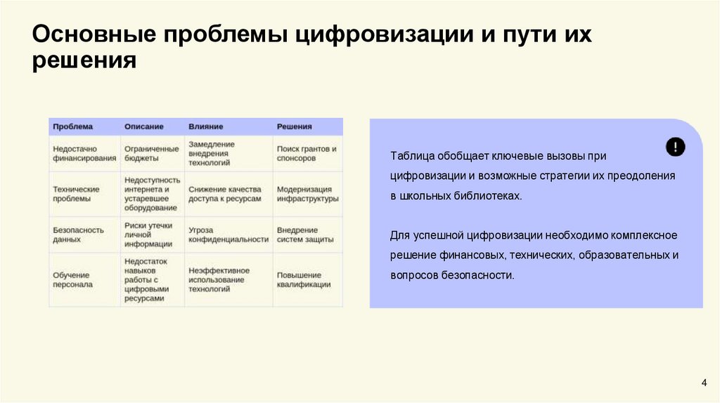 Таблица обобщает ключевые вызовы при